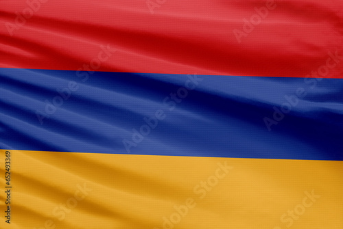 Fototapeta premium Armenia flag is depicted on a sport stitch cloth fabric with folds