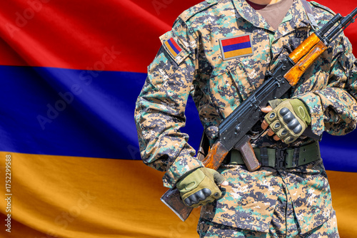 © lucky pics, Fototapeta premium Armenia flag with soldier in military uniform holding assault rifle in front of it