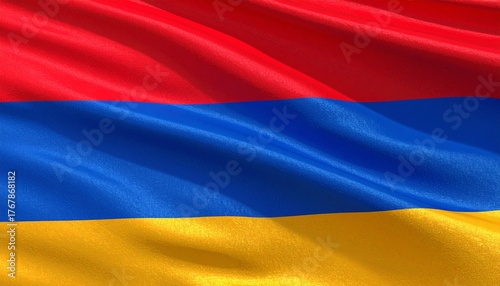 © pureart, Naklejka premium Armenian flag with red, blue, and orange horizontal stripes shown as realistic fabric with folds and waves, symbolizing national pride.