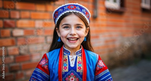 Fototapeta premium Armenian girl in traditional attire joyful expression portrait photo cultural setting
