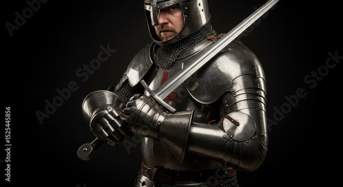 © SEYYAH, Naklejka premium Armored Fighter in Combat Stance with Two-Handed Sword