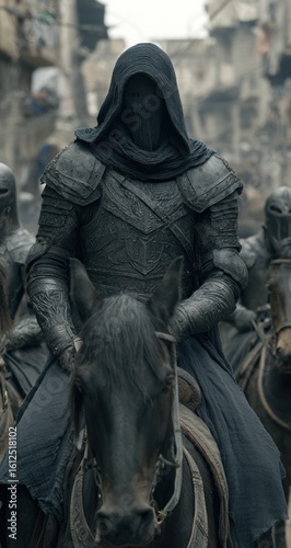 © Bagas, Fototapeta premium Armored figure on horseback with veiled face and shadowed hood leads similar riders through a crowded, faded urban scene