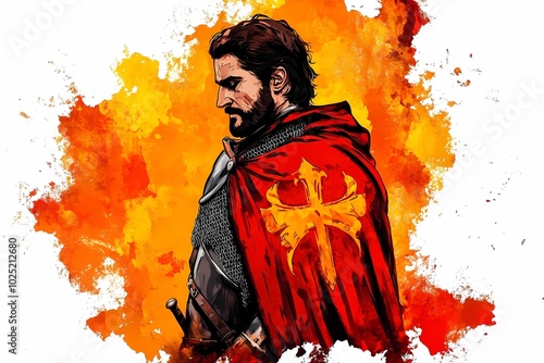 Fototapeta premium Armored knight illustration with a sword and shield, ideal for medieval-themed posters, fantasy art, and historical illustrations.