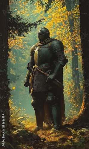 Fototapeta premium Armored Knight in a Forest Glade Medieval Sentinel Standing Guard Amidst Autumnal Woods