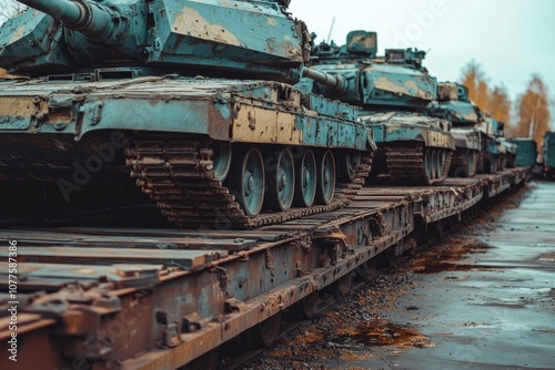 Fototapeta premium Armored vehicles and military equipment transported on railway flat wagon for...