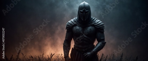 Fototapeta premium Armored Warrior Medieval Helmet Battlefield Misty Atmosphere Dark Ambiance...
