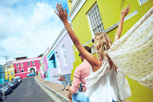 © peopleimages.com, Naklejka premium Arms raised, back and couple on scooter in city for holiday, travel or vacation together. Adventure, freedom and journey with excited people outdoor on moped for break or road trip in urban town