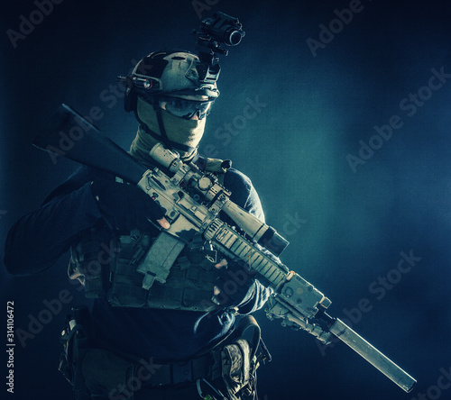 © Getmilitaryphotos, Naklejka premium Army special operations soldier, counter-terrorist crew sniper, marksman in combat helmet, hiding face behind mask, armored service rifle with optical sight, low key studio shoot on blue background