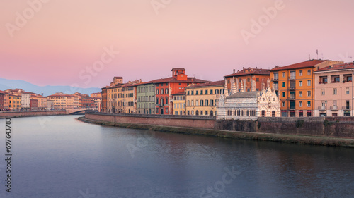 © Igor, Naklejka premium Arno river embankment with Chiesa di Santa Maria della Spina gothic church at sunset, Pisa, Italy