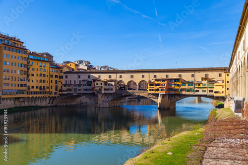 Obraz premium Arno river, houses and old Ponte Vecchio bridge, Florence, Tuscany, Italy
