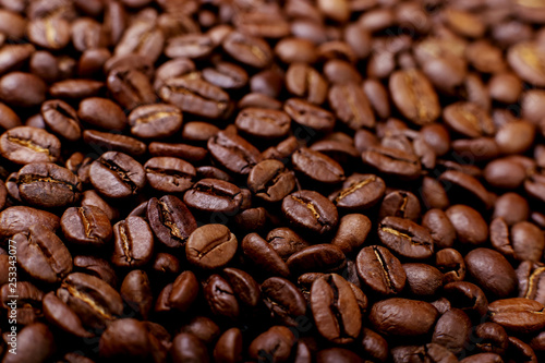 Fototapeta premium Aroma roasted coffee beans, brown background. Soft focus close up.