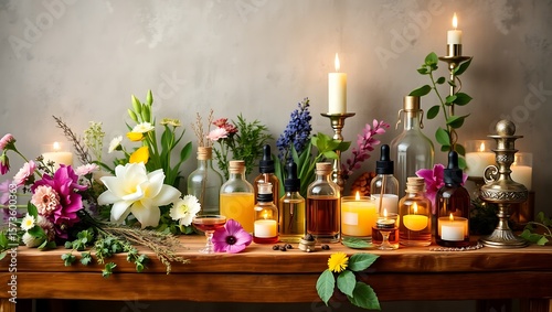 Fototapeta premium "Aromatherapy Bliss: Flowers, Herbs, Candles & Essences on Rustic Wood"