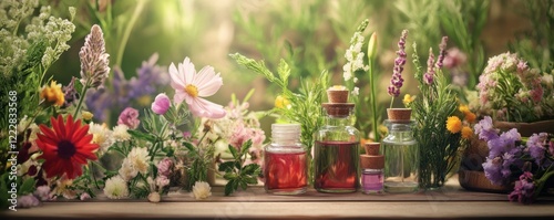 Fototapeta premium Aromatherapy bottles among vibrant wildflowers and herbs in sunlit garden