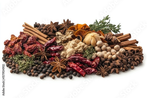 © imagepocket, Fototapeta premium Aromatic blend of spices including star anise, cinnamon, chilies, peppercorns, and dried herbs.