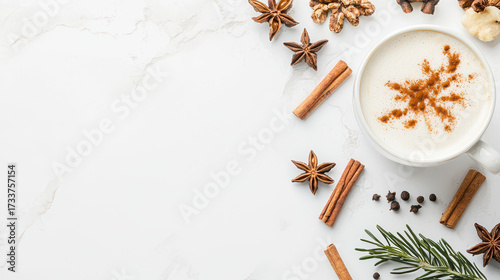 Fototapeta premium Aromatic chai latte with spices, cinnamon, and star anise arranged beautifully on marble surface, evoking warmth and comfort