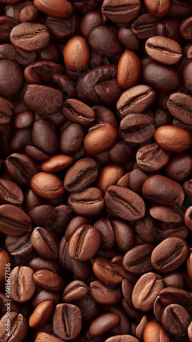 © Vilma, Naklejka premium Aromatic coffee beans arranged in an eye-level close-up. Perfect for cafe menus, websites, and food-related projects.