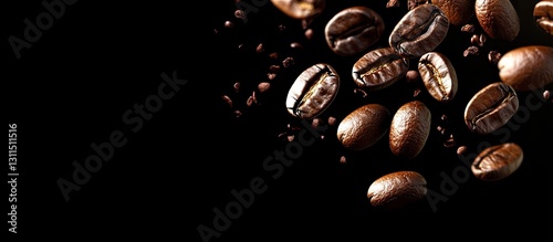 © Rufat, Obraz premium Aromatic coffee beans scattered on a dark background with a smooth black texture providing ample copy space for branding and advertisements