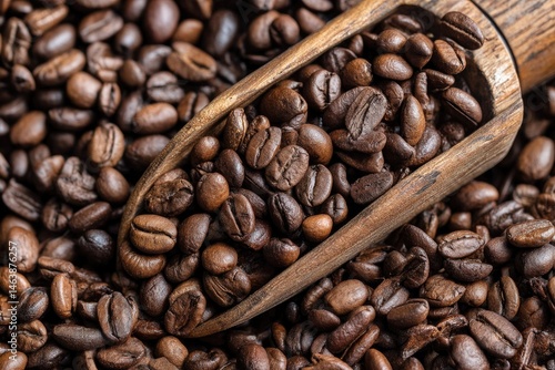 Naklejka premium Aromatic Coffee Beans Spread Extensively Displayed with Wooden Scoop for...