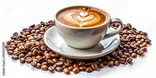 Fototapeta premium Aromatic Coffee Cup with Latte Art, White Background, Coffee Beans, Caffeine,...
