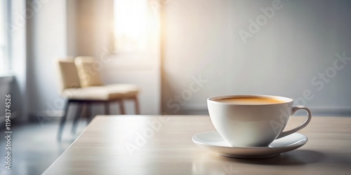 © Ole Studio, Obraz premium Aromatic Coffee in a White Mug on a Light Wooden Table in a Bright Room with a Blurred Background of Comfortable Seating