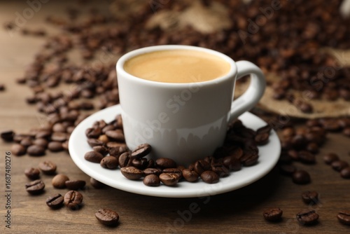 Fototapeta premium Aromatic coffee in cup and beans on wooden table, closeup