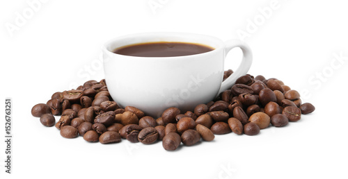 © New Africa, Fototapeta premium Aromatic coffee in cup and pile of beans isolated on white