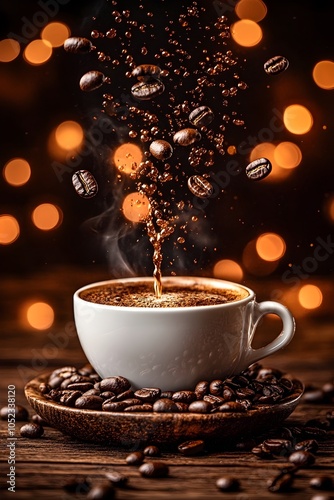Obraz premium Aromatic coffee scene with swirling steam and floating beans on rustic wooden...