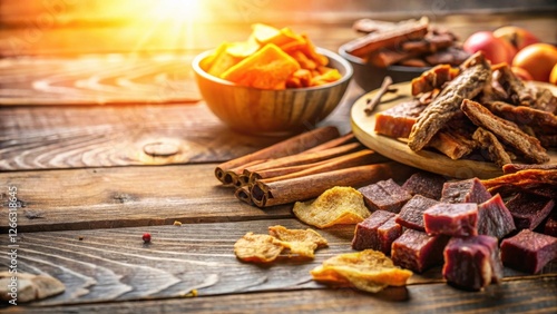 © Collection, Fototapeta premium Aromatic Dried Fruit and Meat Snacks with Cinnamon Sticks on Rustic Wooden Surface