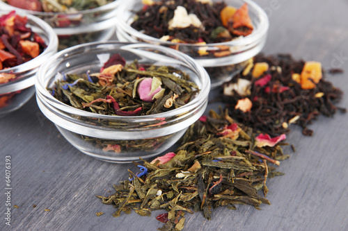 Fototapeta premium Aromatic dry tea in bowls on wooden background