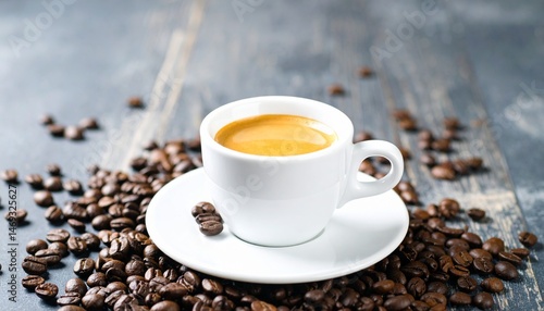 Fototapeta premium Aromatic Espresso Coffee in White Cup Surrounded by Roasted Beans