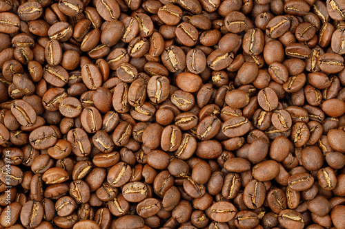 © Mikhail, Fototapeta premium Aromatic roasted coffee beans background. Texture top view.