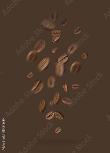 Obraz premium Aromatic roasted coffee beans falling on brown background