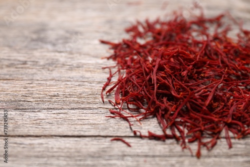 © New Africa, Naklejka premium Aromatic saffron on wooden table, closeup. Space for text