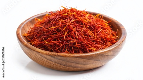© Arnada, Fototapeta premium Aromatic Saffron Spice in Rustic Wooden Bowl - Top View Flat Lay on White Background