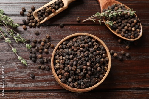 Fototapeta premium Aromatic spice. Black pepper in bowl, spoon and scoop on wooden table, flat lay