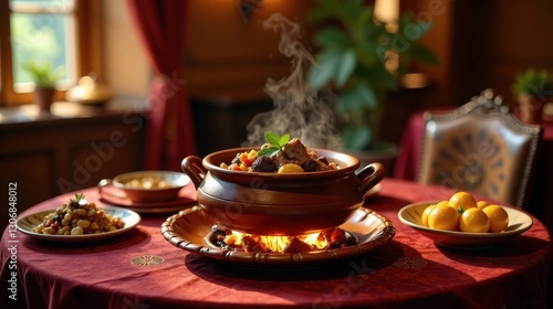 Naklejka premium Aromatic Stew Served in Rustic Earthenware Pot on a Table with Side Dishes