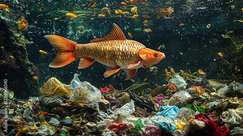 Naklejka premium Arowana Swimming Through Underwater Garbage in a Wide Angle Shot Captures Environmental Pollution Impact