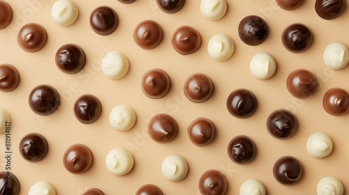 Fototapeta premium Arrange white milk and dark chocolate candies closely together on a beige background