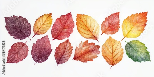 © btiger, Obraz premium arrangement of colorful autumn leaves in shades of purple, orange, red, yellow, and green on a white background showcasing detailed veins and textures