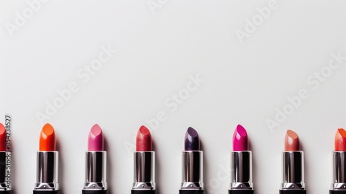 Fototapeta premium Arrangement of colorful lipsticks on white background with copy space Professional makeup and beauty concept