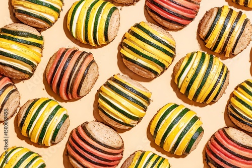 © ginen, Obraz premium Arrangement of sliced vegetables on beige background