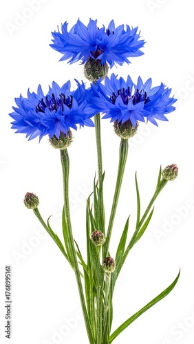 Fototapeta premium Arrangement of vibrant, blue blooms with buds and delicate green foliage