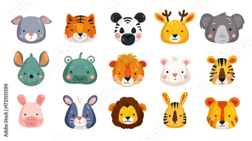 © hafiz, Naklejka premium Array of 15 cute, cartoonish animal heads with soft textures and bright colors