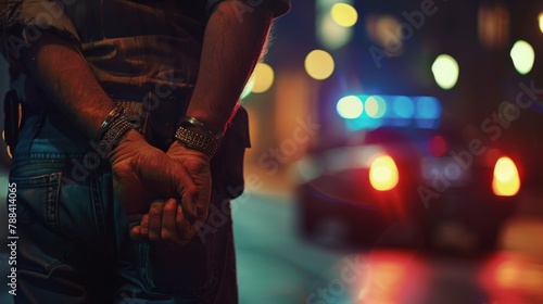 Naklejka premium Arrested man with his arms crossed behind his back and a blurry police car in...