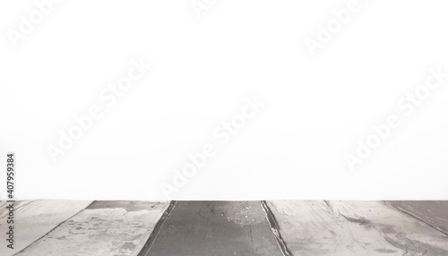 © ODIN Daniel, Fototapeta premium Arrière-plan blanc avec support de bois pour présentation d'objets publicitaires pour promotion de produits. Aspect sol en bois, fond blanc uni.
