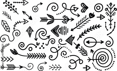 © Rabia, Obraz premium Arrow Line Vector Collection — Hand Drawn Doodle Arrows, Marker Brush Sketch Icons, Cute Elements for Creative Decoration