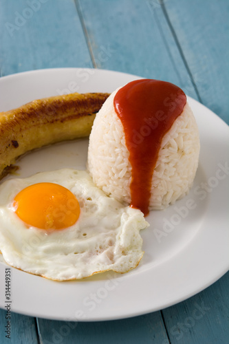 © chandlervid85, Fototapeta premium Arroz a la cubana Typical Cuban rice with fried banana and fried egg on a plate on wooden table. Close up