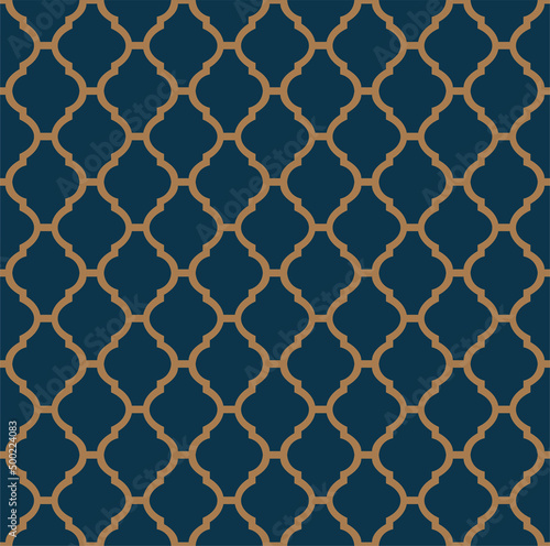 © mushan, Naklejka premium Art deco line art. Moroccan grid pattern in gold and blue color. Decorative seamless background.