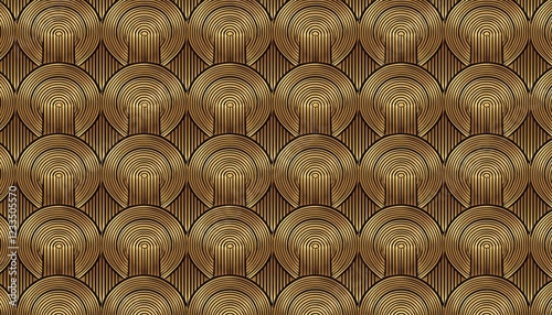 © netsay, Obraz premium Art Deco Masterpiece Ornate Gold Circle Stripes with Arching Line Patterns and Fence Background, Elevating Modern Interior Design or Graphic Art