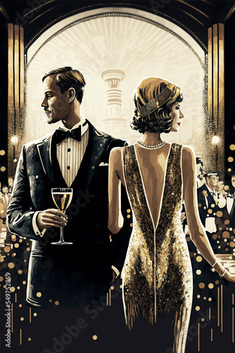 Obraz premium Art Deco Party Celebration Illustration, Couple at a party in the style of the early 20th century, Gatsby Style, Fashion Illustration , New Year's Eve